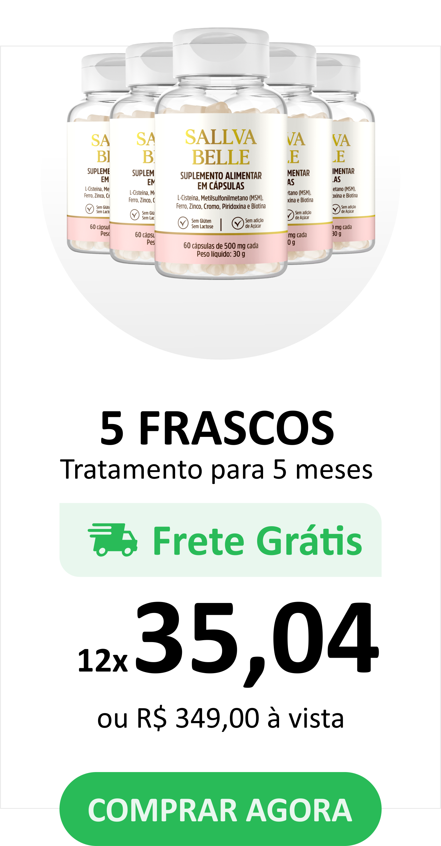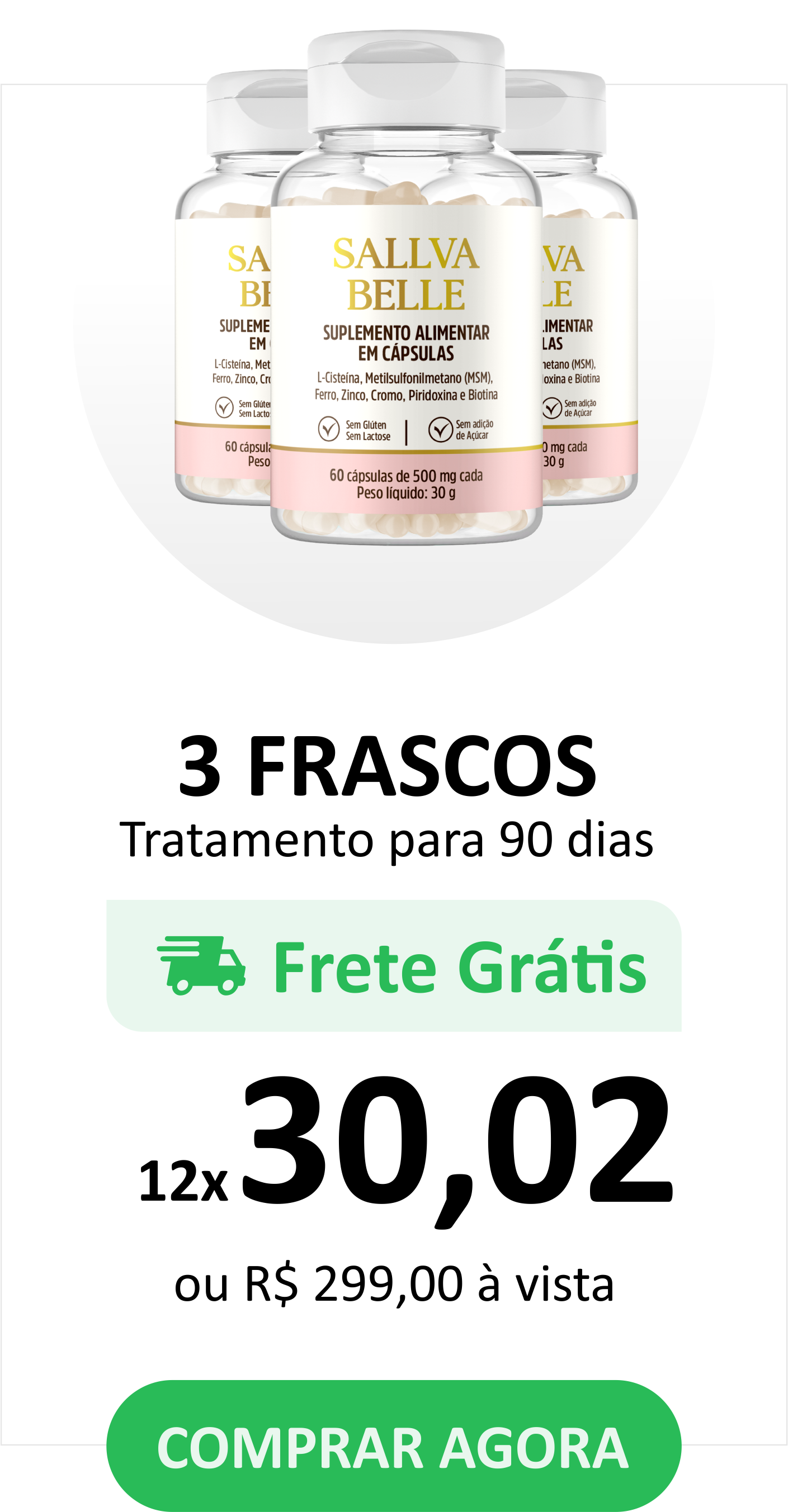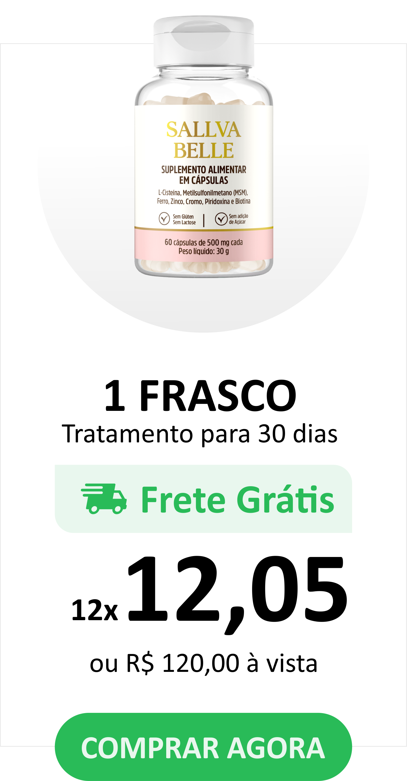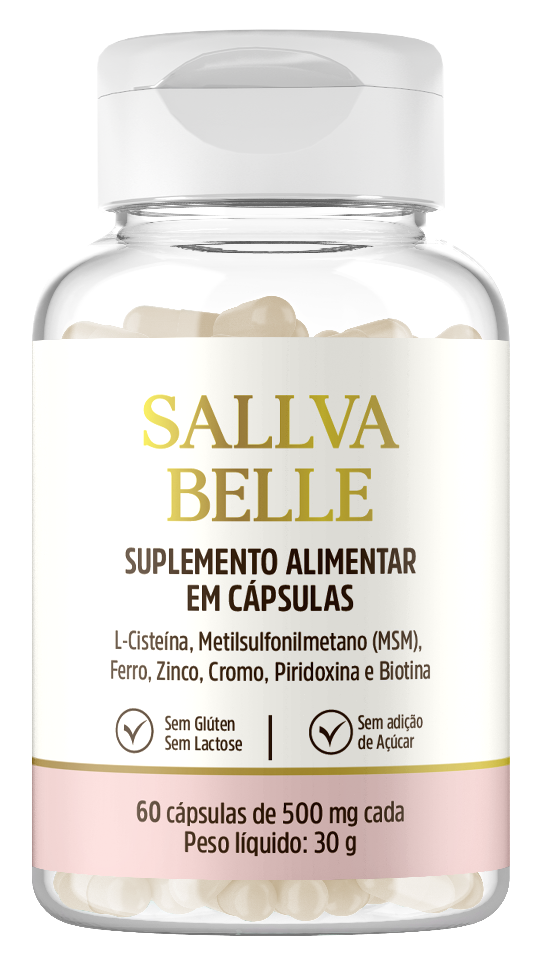 A fórmula de Sallva Belle é isenta dos principais alérgenos como glúten e lactose. No entanto, se você tem alergia a algum dos componentes listados na embalagem (L-Cisteína, MSM, etc.), não deve consumir o produto. Em caso de qualquer reação adversa, suspenda o uso e procure orientação médica.