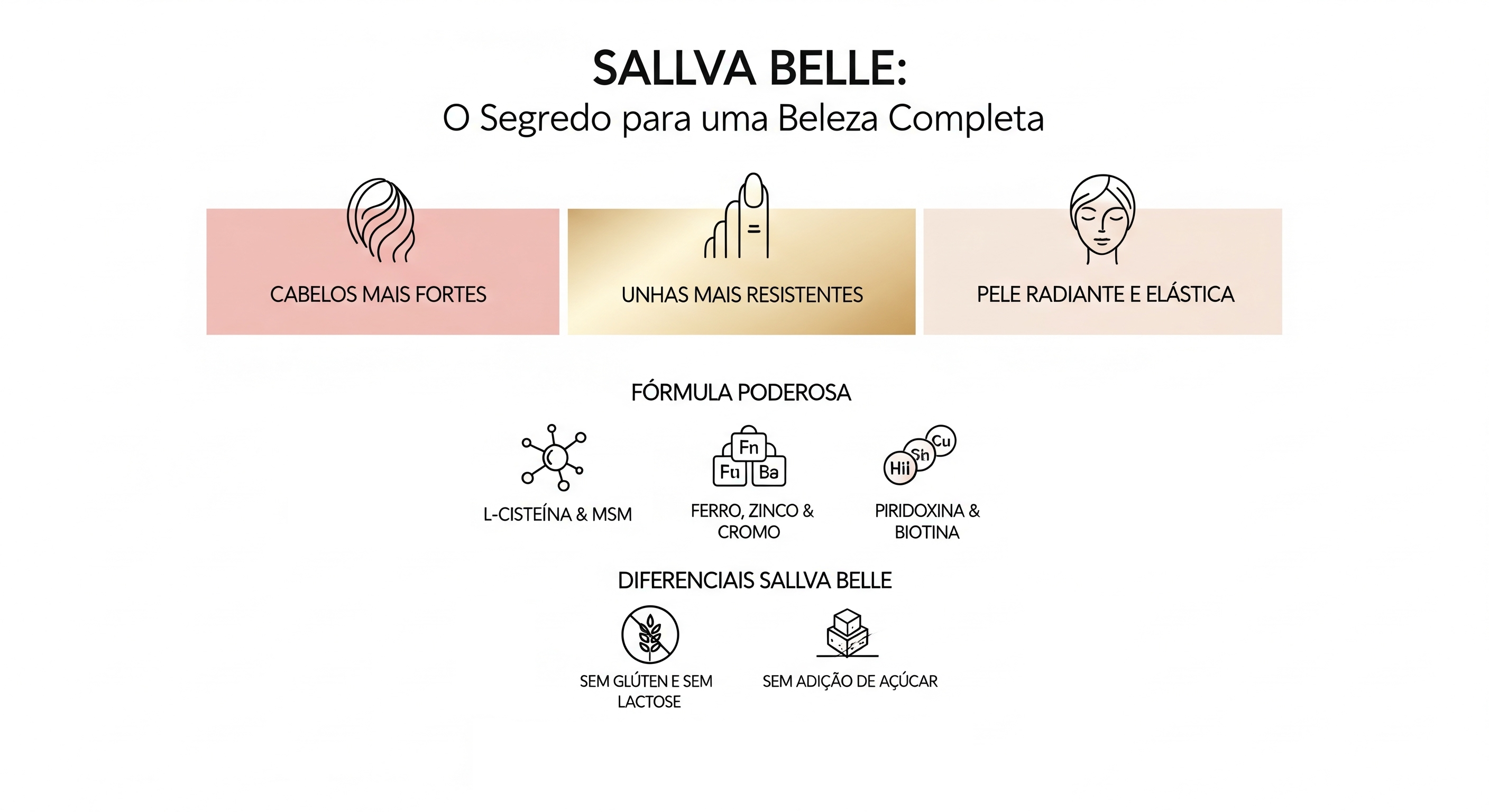 Sallva Belle é indicado para adultos que desejam fortalecer e nutrir cabelos, pele e unhas. É um produto livre de glúten e lactose, tornando-o acessível a um público mais amplo. Em caso de dúvidas, recomendamos consultar um profissional de saúde.